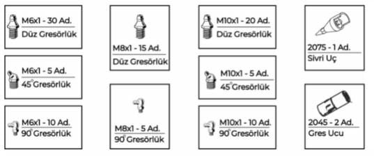 Çok sayıda popüler tür ve boyutta metrik gresörlük seti; uzun ömürlü kullanım için bütün nipeller bilyeli, sertleştirilmiş yaylı olarak kullanılmıştır.